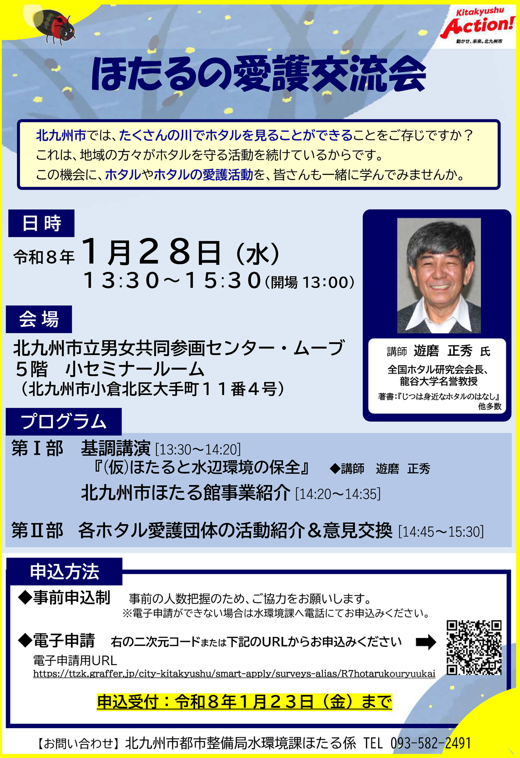 イベント ほたるの愛護交流会 2026.1.13 日時:令和8年1月28日(水)13:30~15:30(開場13:00)場所:北九州市立男女共同参画センター・ムーブ 5階小セミナールーム(北九州市小倉北区大手町11番4号)主催者:北九州市都市整備局水環境課ほたる係 TEL 093-582-2491詳しくは下記チラシをご覧ください。 イベント 2026年1月のイベント一覧 前の記事