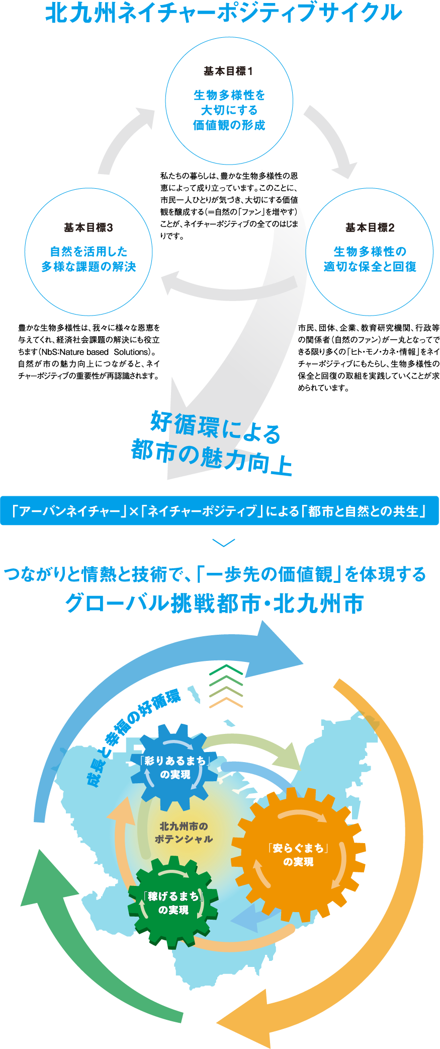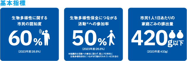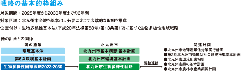 ■北九州市の生物多様性を適切に保全・回復し、持続可能な方法で利用するとともに、その魅力を効果的に発信することで、市民が自然に触れ、楽しむ機会を増やします。